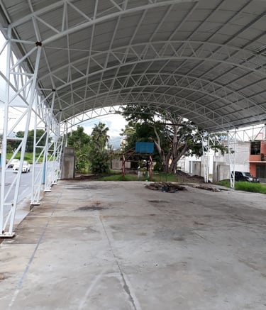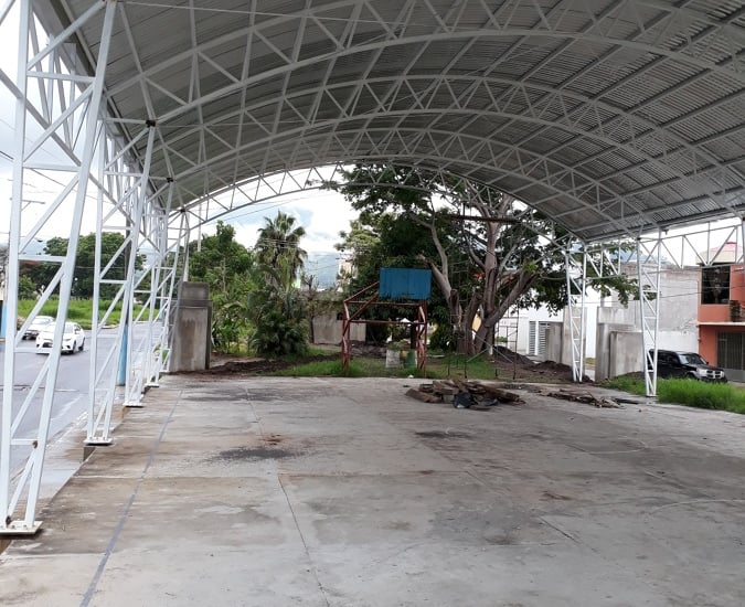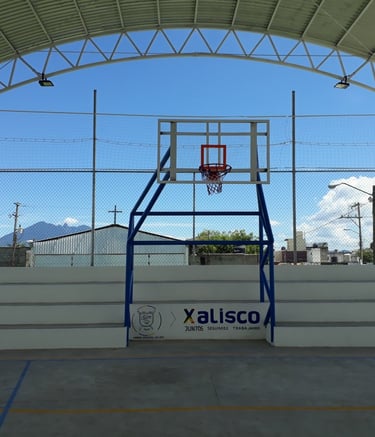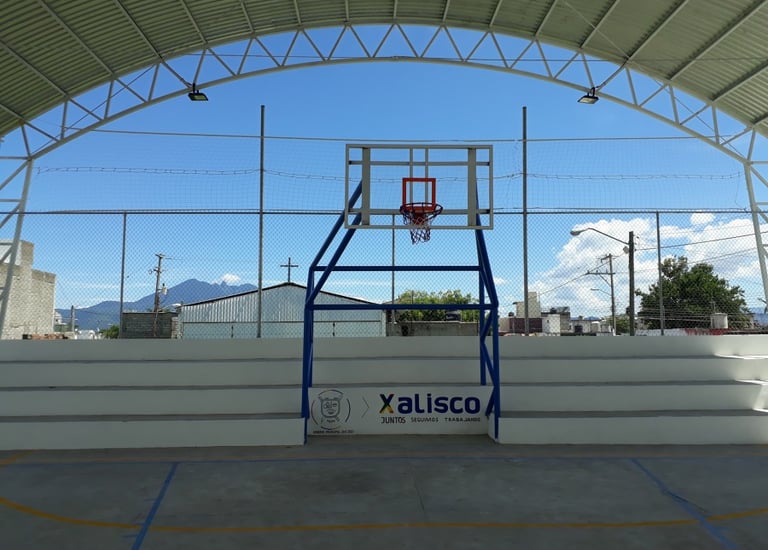 Cancha de usos múltiples en el municipio de Xalisco Nayarit. Se construyo una cubierta a base de armaduras de acero y lamina galvanizada. Se dio mantenimiento a porterías existentes, se construyo un modulo de baños con bodega y gradas dentro del mismo espacio publico.